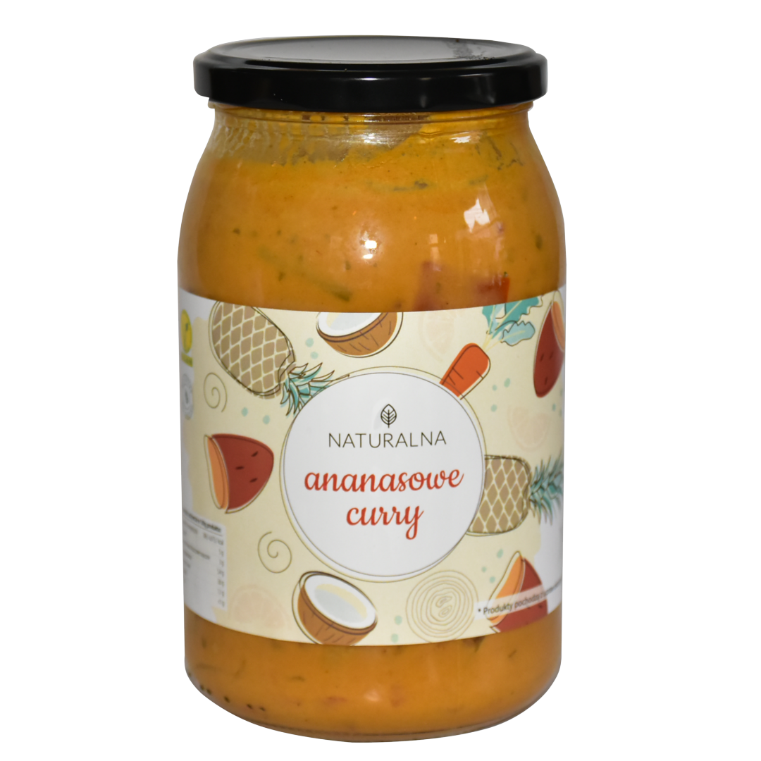 Skład: bulion warzywny ( woda, marchew, pietruszka, por, cebula, przyprawy), mleko kokosowe ( ekstrakt z kokosa (60%), woda), marchew, batat, ananas, papryka, pomidory bez skórki ( pomidory, sok pomidorowy ), cebula, olej rzepakowy, sok z pomarańczy, czosnek, trawa cytynowa, kolendra, przyprawy