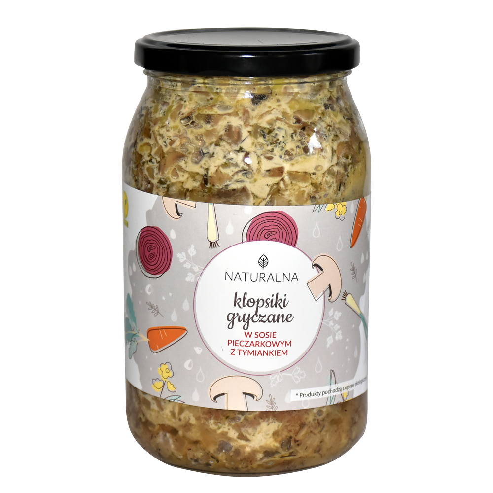 Skład: *kasza gryczana, *kasza jaglana, *bulion warzywny (woda, seler, marchew, pietruszka, por, cebula, przyprawy), śmietanka z białka soczewicy, mąka ziemniaczana, *cebula, *olej rzepakowy, *sos sojowy (woda, soja, sól), *przyprawy, sól