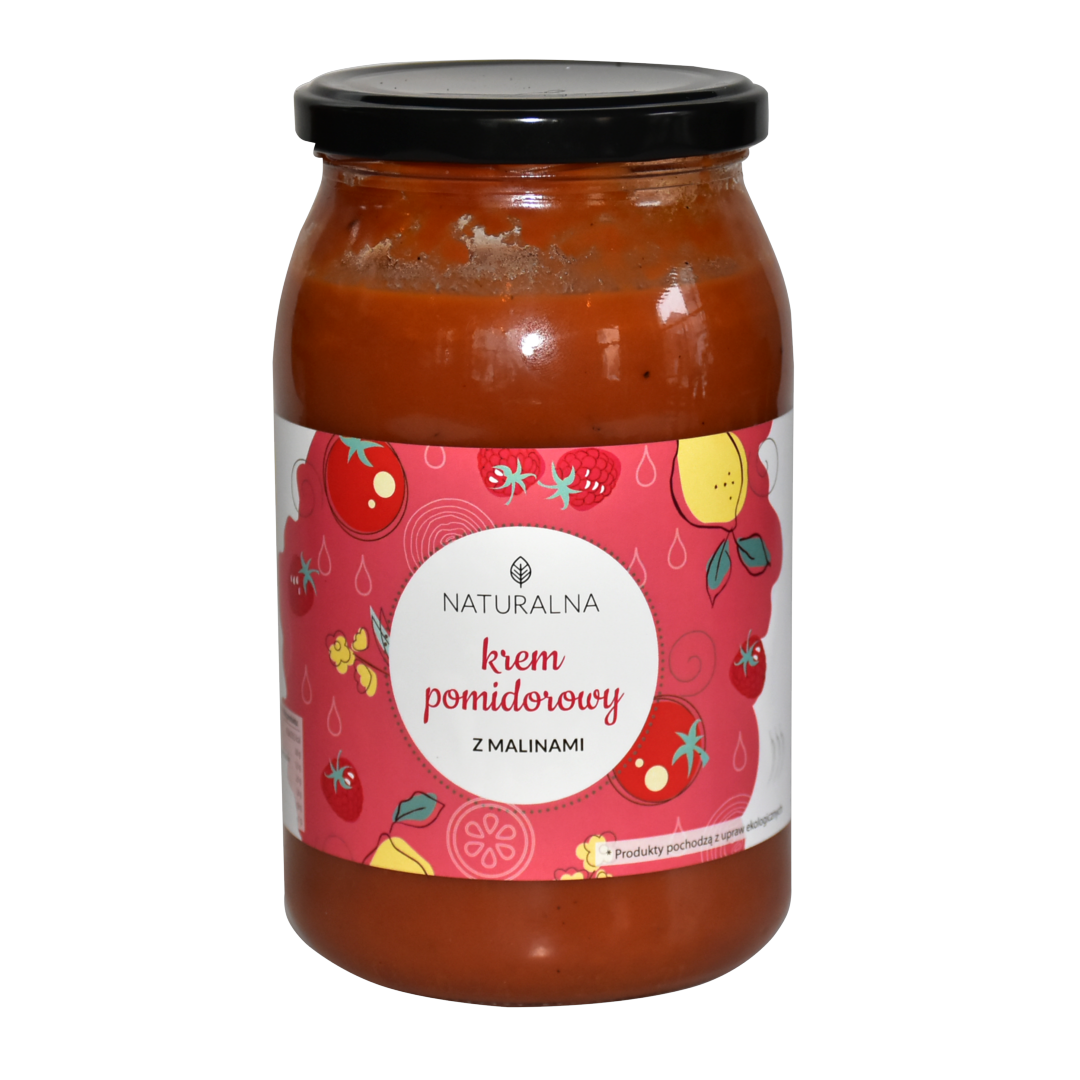 Skład: *pomidory pelati (obrane pomidory, sok pomidorowy, kwas cytrynowy), *bulion warzywny (woda, marchew, pietruszka, por, cebula, przyprawy), maliny, *cebula, *olej rzepakowy, *przyprawy